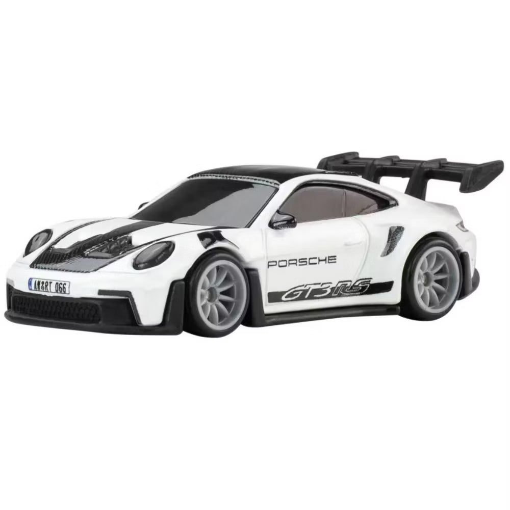 This Hot Wheels Premium release captures the aggressive stance and race-bred DNA of the Porsche 911 GT3 RS with exceptional detail. Featuring Real Riders rubber tires on premium wheels, metal body construction, and authentic Gran Turismo livery, this casting represents the pinnacle of 1:64 scale craftsmanship. The GT3 RS's signature rear wing, vented hood, and racing graphics are faithfully reproduced.