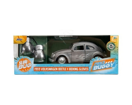 Get ready to add a unique and collectible item to your collection! The JADA 1959 Volkswagen Punch Buggy Beetle comes in a stylish gray with silver flames and even includes a boxing gloves accessory. Perfect for those who appreciate both cars and sports, this piece is sure to stand out and add extra personality to your collection.