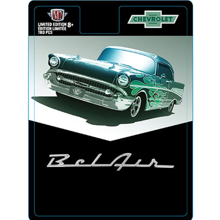 This M2 Machines 1957 Chevrolet Bel Air features a striking black body with vibrant green flame graphics, capturing the essence of classic hot rod culture. The '57 Bel Air is one of the most iconic American cars ever produced, and this custom flame treatment pays tribute to the hot rod and custom car scene. Featuring an opening hood that reveals a meticulously detailed engine, premium rubber tires, and authentic badging, this casting showcases M2's commitment to collector-grade quality.
