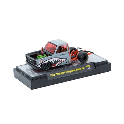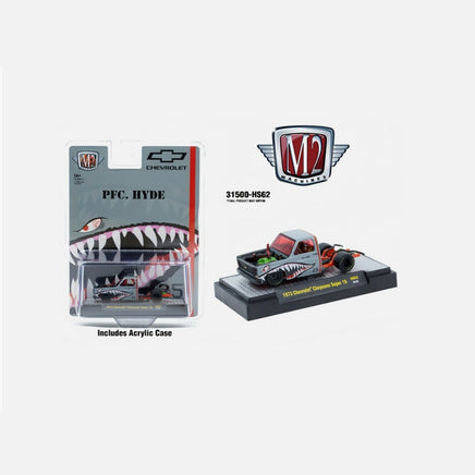 The M2 Machines 1973 Chevrolet Cheyenne Super 10 “PFC. HYDE” Shark Face is a meticulously crafted diecast model that captures the distinct military-inspired design of this classic truck. Featuring detailed shark face artwork and authentic 1973 Cheyenne styling, this collectible offers precision and historical accuracy for enthusiasts. Its high-quality construction and fine detailing make it an essential addition to any serious diecast collection, reflecting both automotive heritage and military iconography with expert craftsmanship.