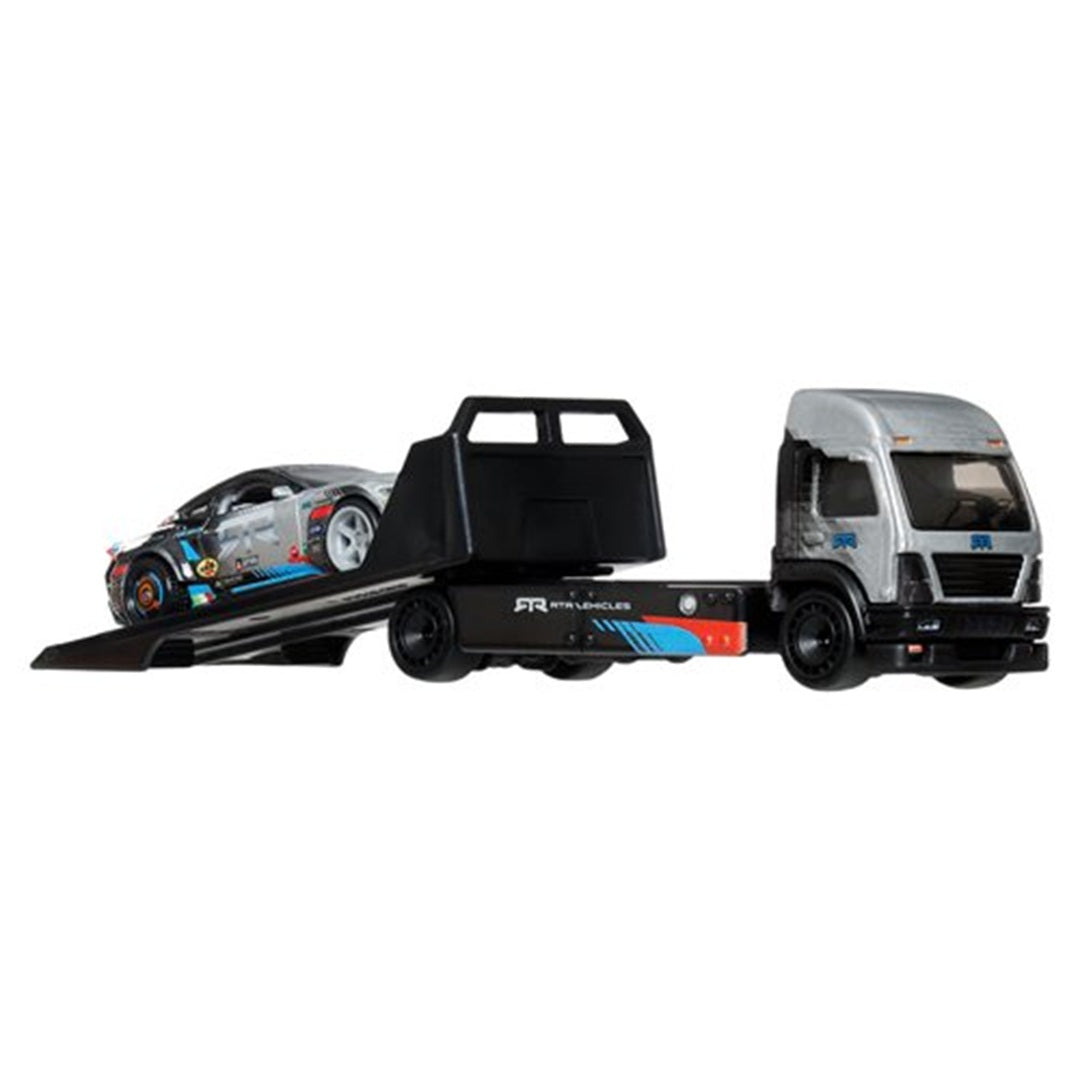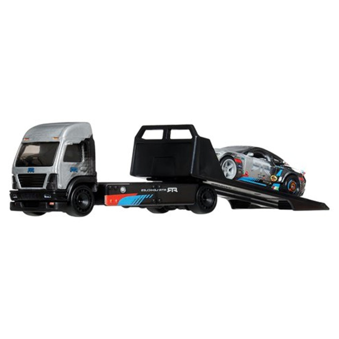 Experience modern drift dominance with this Hot Wheels Team Transport set featuring the 2024 Ford Mustang RTR Spec 5-FD paired with a sleek Aero Light hauler. This premium two-piece set celebrates RTR's Formula Drift championship legacy with Real Riders rubber tires, metal/metal construction, and authentic detailing that captures the cutting-edge style of contemporary motorsport.